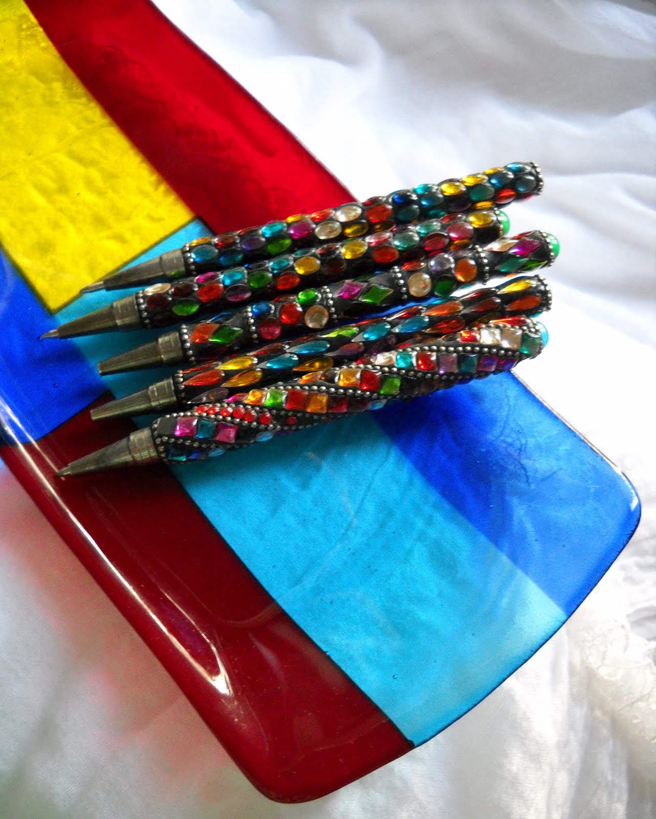 My dear friends Art and Donna came for dinner and brought the most wonderful house-warming gift, this exquisite dish handmade by their oh-so-talented daughter, Jennifer. I think it suits my jeweled pens splendidly! 🙂