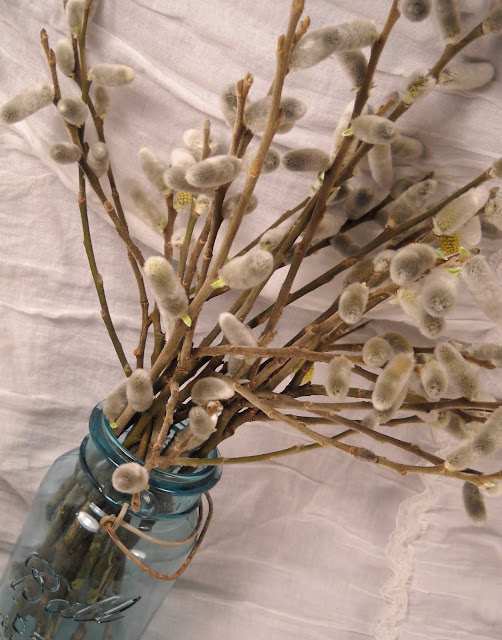 Sunday morning my friend Rose gave me a bouquet of pussy willows! (Thank you!!) I learned that you should never, ever, ever put them in water. If you don’t, they last for simply ages. π