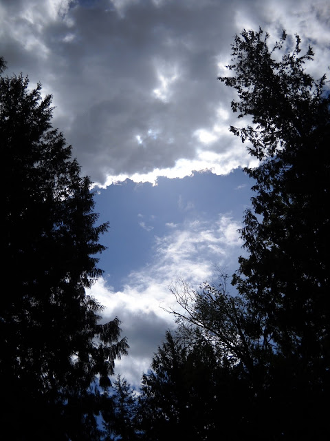 This afternoon thick clouds scudded across the skies, letting random splashes of sunlight warm my perch in the doorway. Those fickle bits of warmth felt so good and I loved looking up between the trees, waiting in anticipation for the next one. ๐