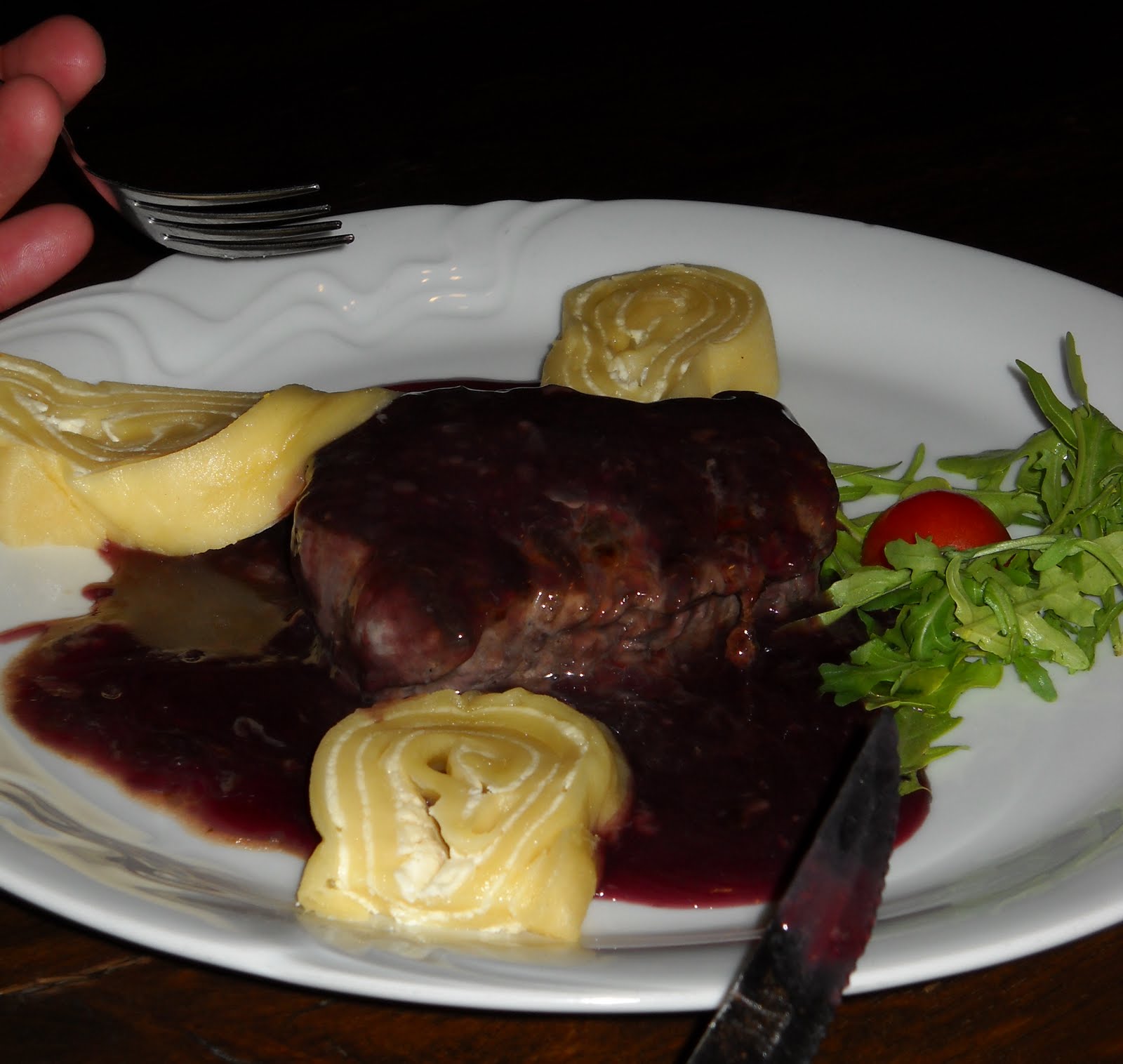 Ben went very traditional with roasted horse meat in some sort of sauce and a stuffed jelly-roll type pasta. He obligingly gave us a taste of the meat so we could say we’d eaten horse. 🙂