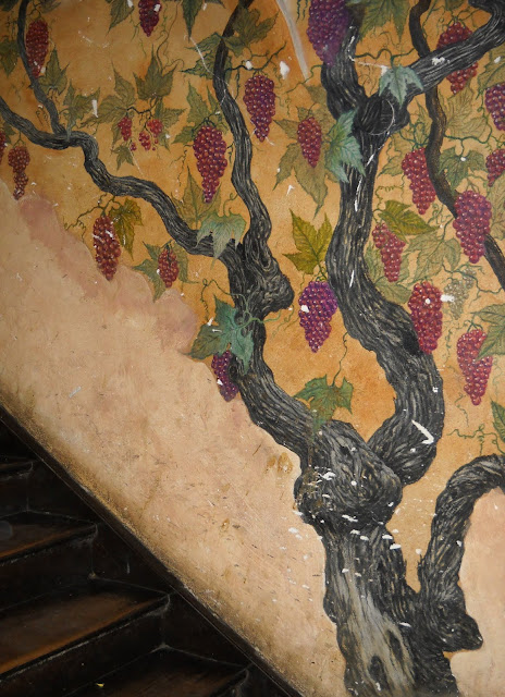 Everything inside seemed old in that comfy, well-worn way. Creaky wooden stairs slick from thousands of feet ascending and descending, old wooden benches worn smooth from many a scooting bottom, and this lovely vine mural pocked and darkened from hands pressed against it as patrons climbed up to the loft for dinner.