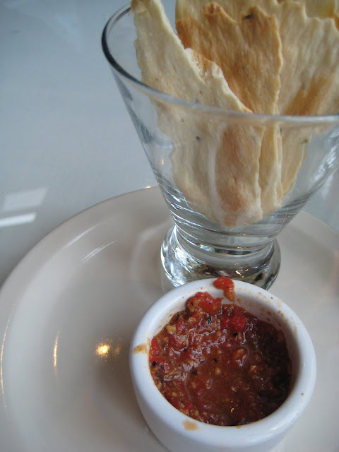A very friendly, efficient young woman named Kelly showed us to our table overlooking a lovely little cove and left us to peruse the menu. She returned quickly to bring us an amuse bouche (indeed, for two) of a Mediterranean ajvar with rosemary crackers,